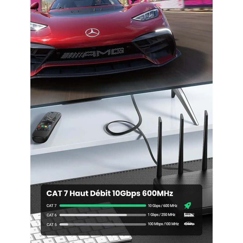 UGREEN Câble réseau CAT7 Flat. Longueur 3 m. Vitesse ultra-rapide jusqu’à 10 Gbps. Blindage U/FTP. Réduction des interférences. Design plat discret. Compatible box, routeur, PC et console.