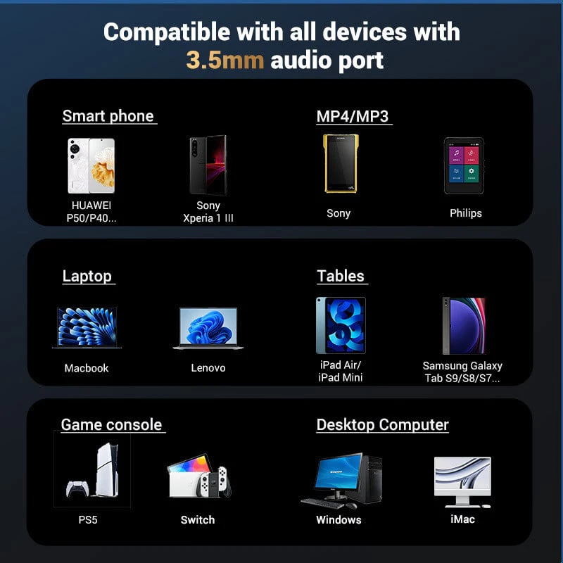 | Compatibilité | Smartphones, tablettes, PC, lecteurs MP3 |