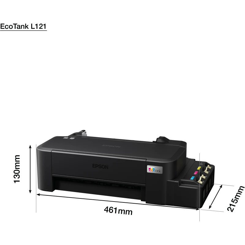 Epson EcoTank L121. Imprimante jet d’encre A4 à réservoirs rechargeables. Technologie Micro Piezo pour des impressions fiables. Réservoirs 4 couleurs (noir, cyan, magenta, jaune). Encre incluse pour ~ 4 500 pages N&B ou ~ 7 500 pages en couleur — coût par page très économique. Vitesse d’impression : 9 ppm N&B / 4,8 ppm couleur (norme ISO). Résolution 720 × 720 dpi. Bac papier 50 feuilles. Formats supportés : A4, Lettre, Legal. Connectivité USB filaire. Imprimante compacte (461 × 215 × 130 mm, env. 2,4 kg) — idéal pour bureau ou usage domestique. Installation simple, faible encombrement. Parfait pour documents, cours, rapports, travaux scolaires ou impression de masse à bas coût..