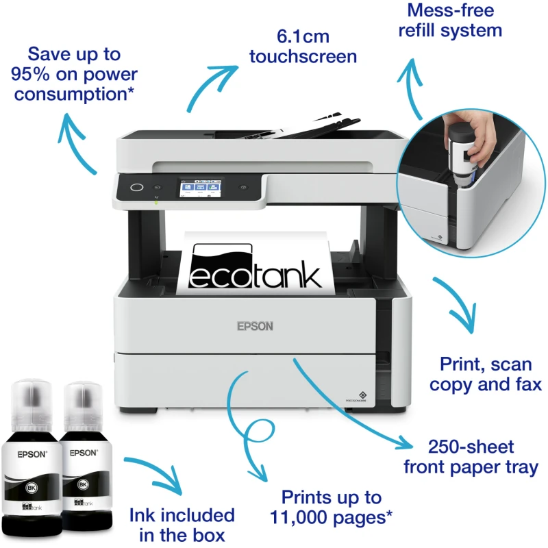 Epson EcoTank M3170 Imprimante A4 Wi-Fi. Jet d’encre multifonction tout-en-un. Réservoirs d’encre rechargeables haute capacité. Très faible coût par page. Impression, numérisation et copie. Connexion sans fil Wi-Fi et mobile. Écran intuitif pour réglages faciles. Qualité d’impression nette et couleurs vives. Idéal pour bureaux et usage domestique..