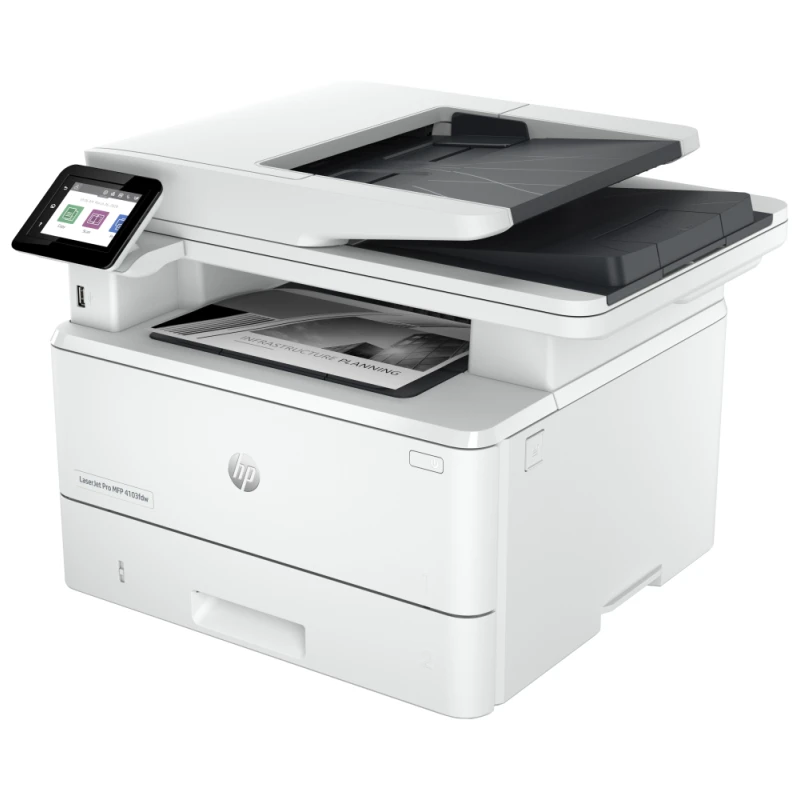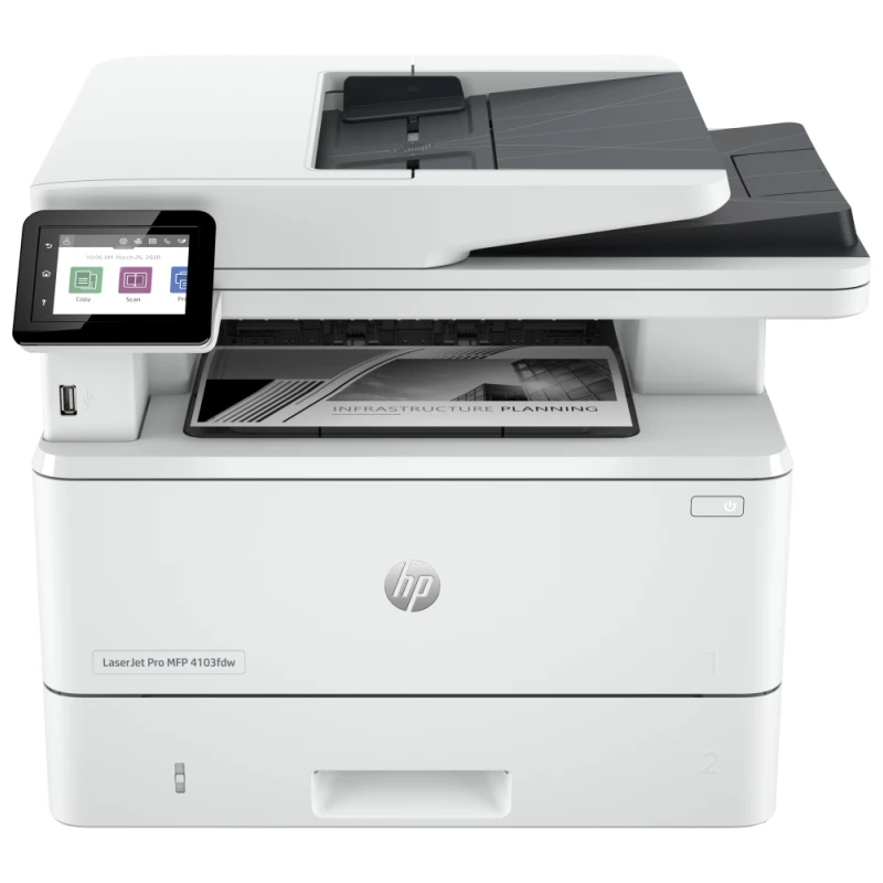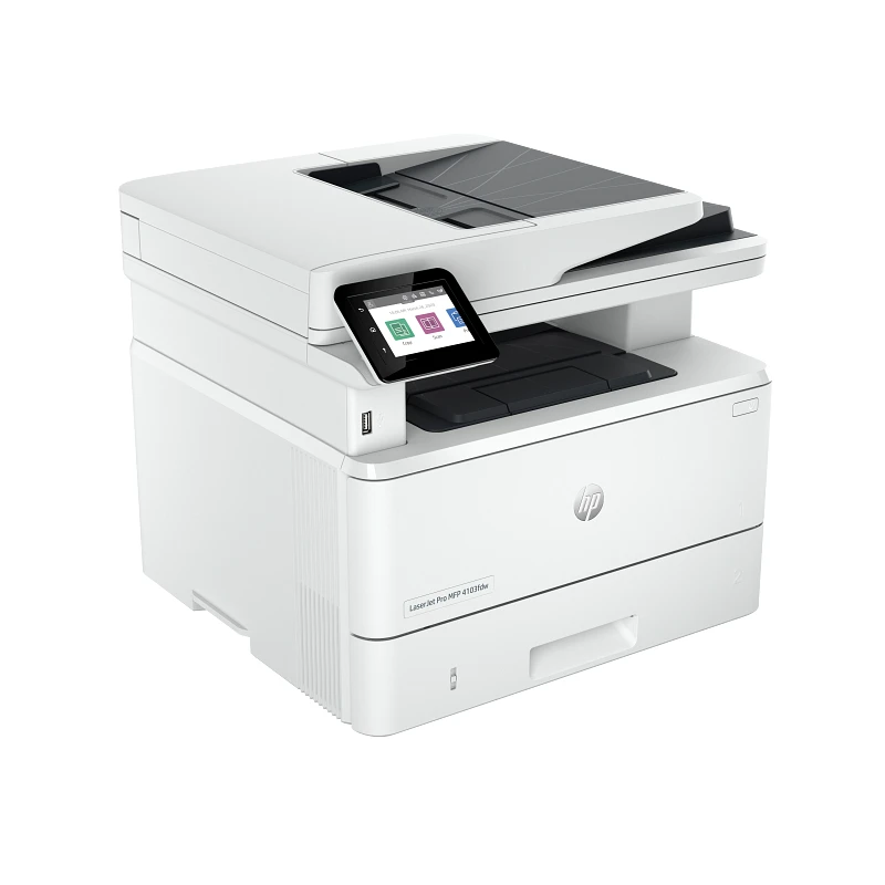 HP LaserJet Pro 4103fdw. Imprimante multifonction laser monochrome. Impression, copie, scan et fax. Format A4. Vitesse jusqu’à 40 pages/min. Impression recto-verso automatique. Connexion Wi-Fi, Ethernet et USB. Impression mobile HP Smart, AirPrint et Mopria. Écran tactile couleur. Sécurité renforcée HP Wolf Pro Security. Idéale pour PME et environnements professionnels.