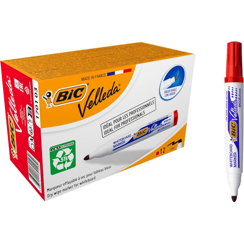 BIC Velleda 1701 ECOlutions rouge. Marqueur effaçable tableau blanc. Encre rouge intense. Pointe moyenne. Effaçage propre. Conception écologique. Parfait pour annotations et mises en évidence.