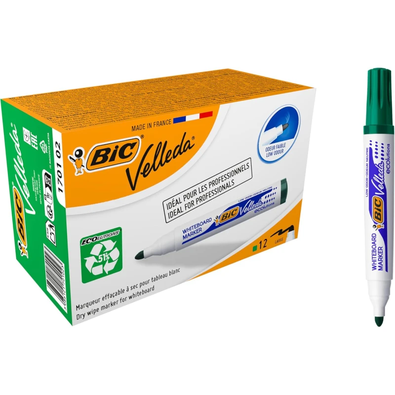 Le marqueur tableau blanc BIC Velleda 1701 ECOlutions vert est conçu pour une écriture fluide, lisible et propre sur tous types de tableaux blancs, Il est parfaitement adapté aux salles de classe, bureaux professionnels et espaces de formation.