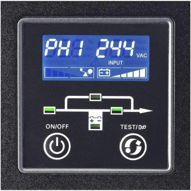 L’Eaton 9E offre des configurations 1:1 ou 3:1, s’adaptant à différents environnements électriques, Son écran LCD fournit une lecture claire de l’état du système, des charges et des paramètres essentiels.