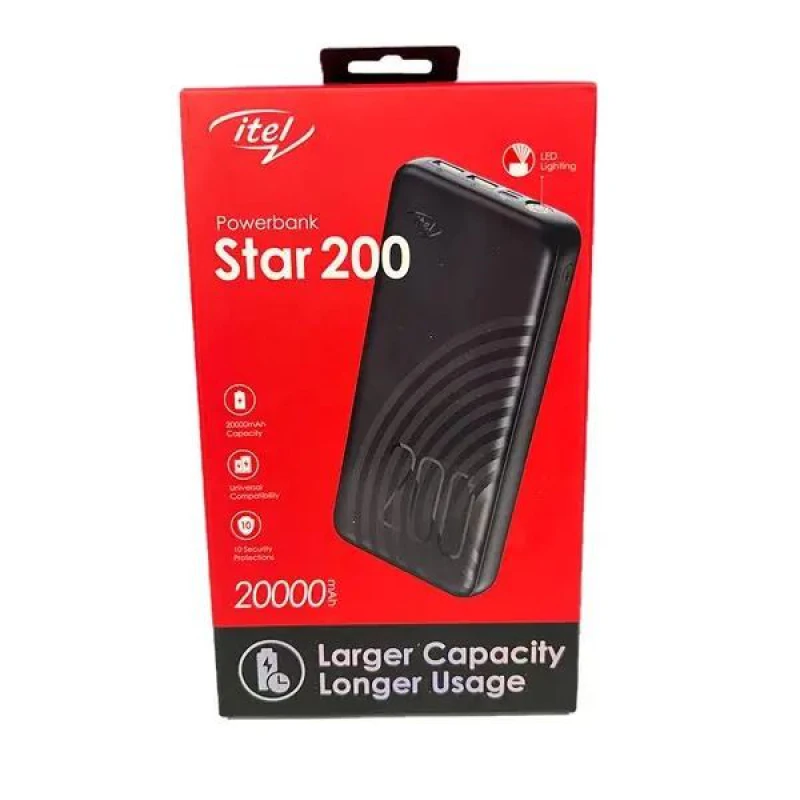Itel STAR200P 20000 mAh. Double port USB Type-C et USB-A pour recharge rapide. Capacité élevée pour plusieurs cycles de charge. Compatible smartphones, tablettes et appareils USB. Design compact et portable. Indicateur LED pour niveau de batterie. Sécurité intégrée contre surcharge et surchauffe.
